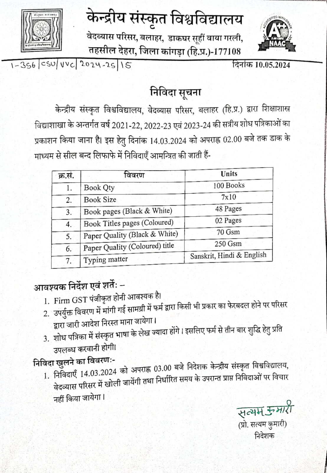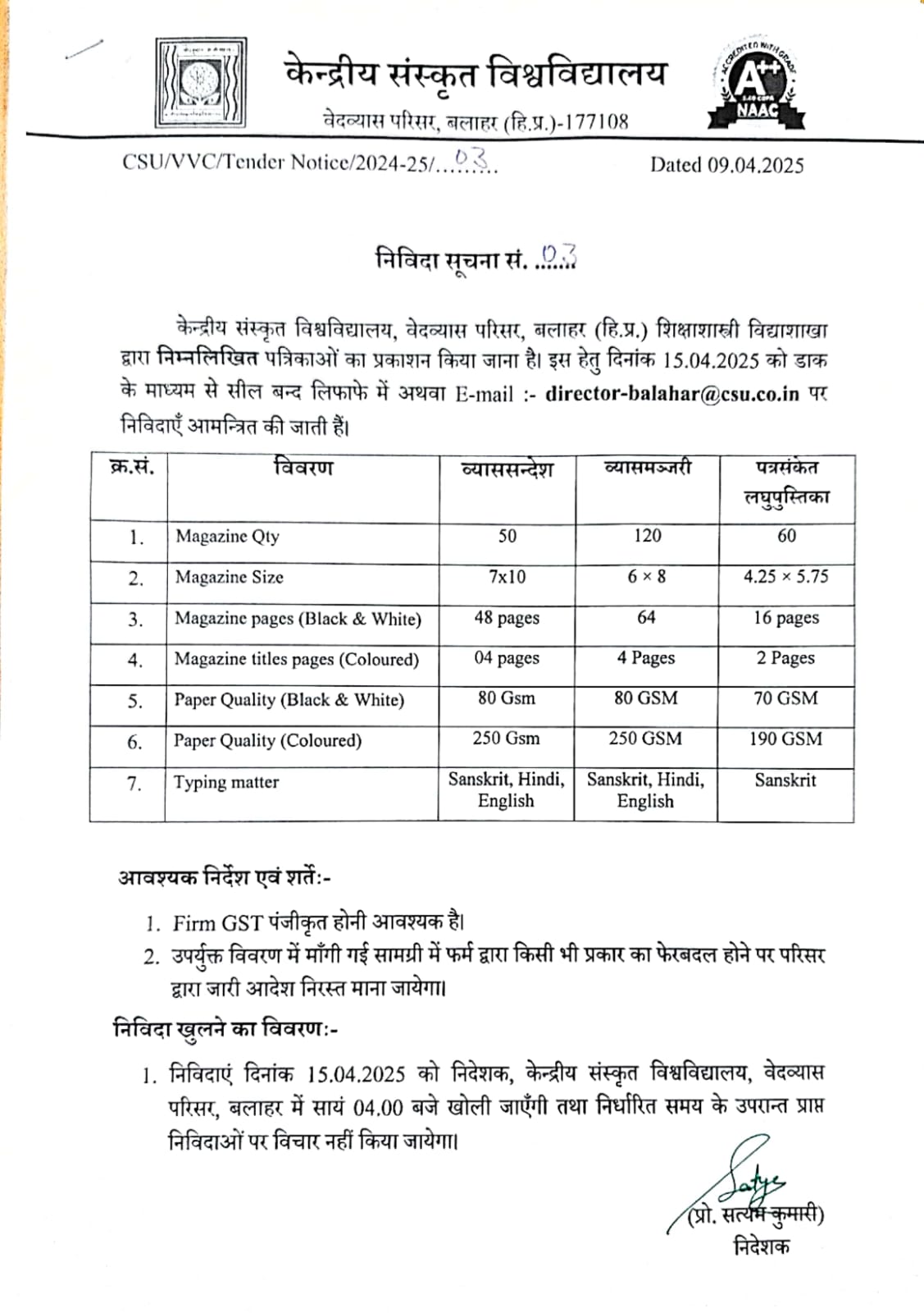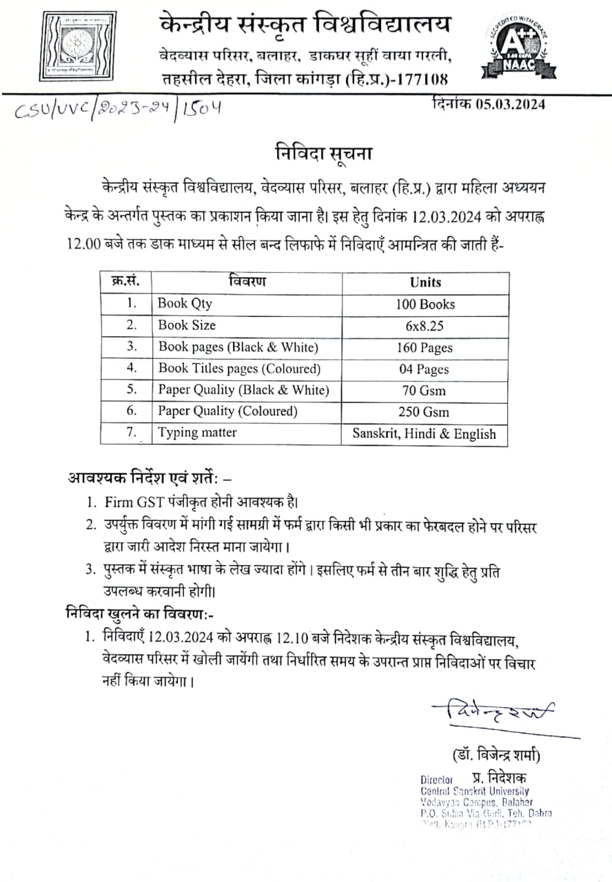 Notice for tender publication of books for Vedanat departmnet, Vedvyas Campus