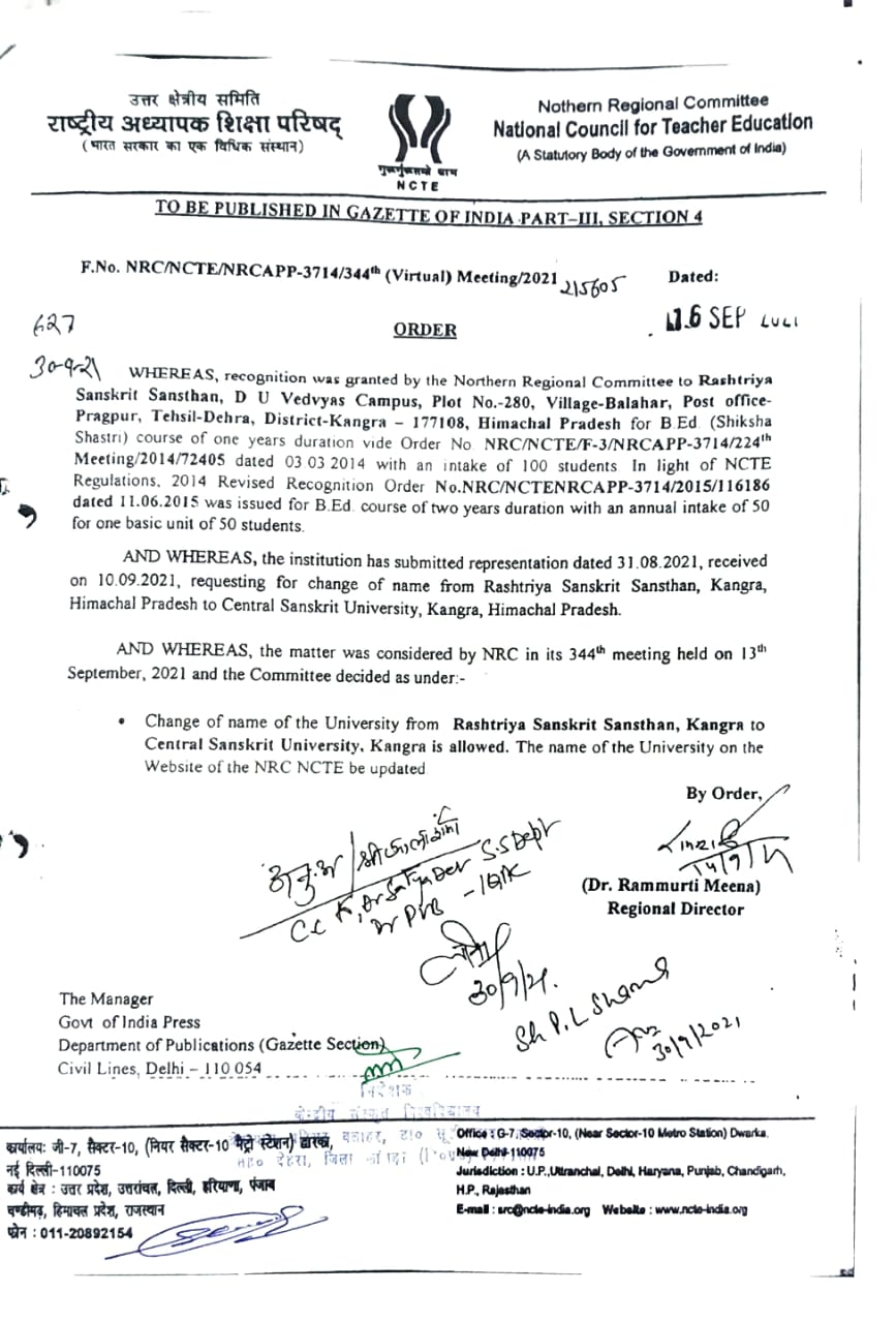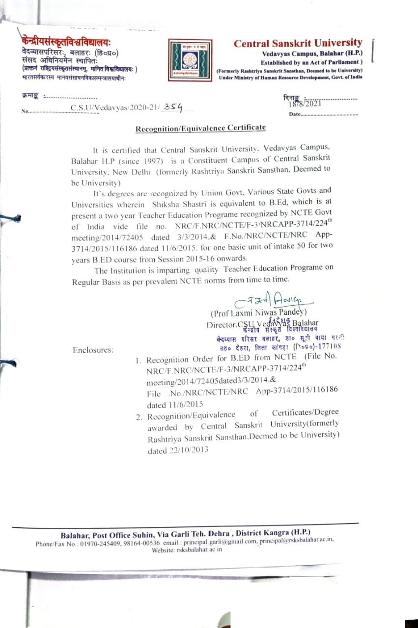 During the golden jubilee year of India’s Independence, the Rashtriya Sanskrit Sansthan established Kendriya Sanskrit Vidyapeetha at Garli, District Kangra, in the State of Himachal Pradesh on 16.09.1997. It was the renamed as the Garli Campus of Rastriya Sanskrit Sansthan (Deemed University) on 07.05.2002. Later on, From the year of 2020, the campus came to be known as Central Sanskrit University, Vedvyas Campus, Balahar. In the academic year of 2014-15 the Department of Education was formally established in the Vedavyas Campus. The quality and character of our schools are dependent largely upon the quality and character of the teachers who staff them. Keeping in view these tasks attributed to the educator, Department of Shikshashastra of Vedavyas Campus has evolved main focus on equipping the Sanskrit teacher educators with spoken Sanskrit skills, communication skills, soft skills and practical knowledge of new education technology.Shiksha Shastri (B.Ed.) Sanctioned programmes